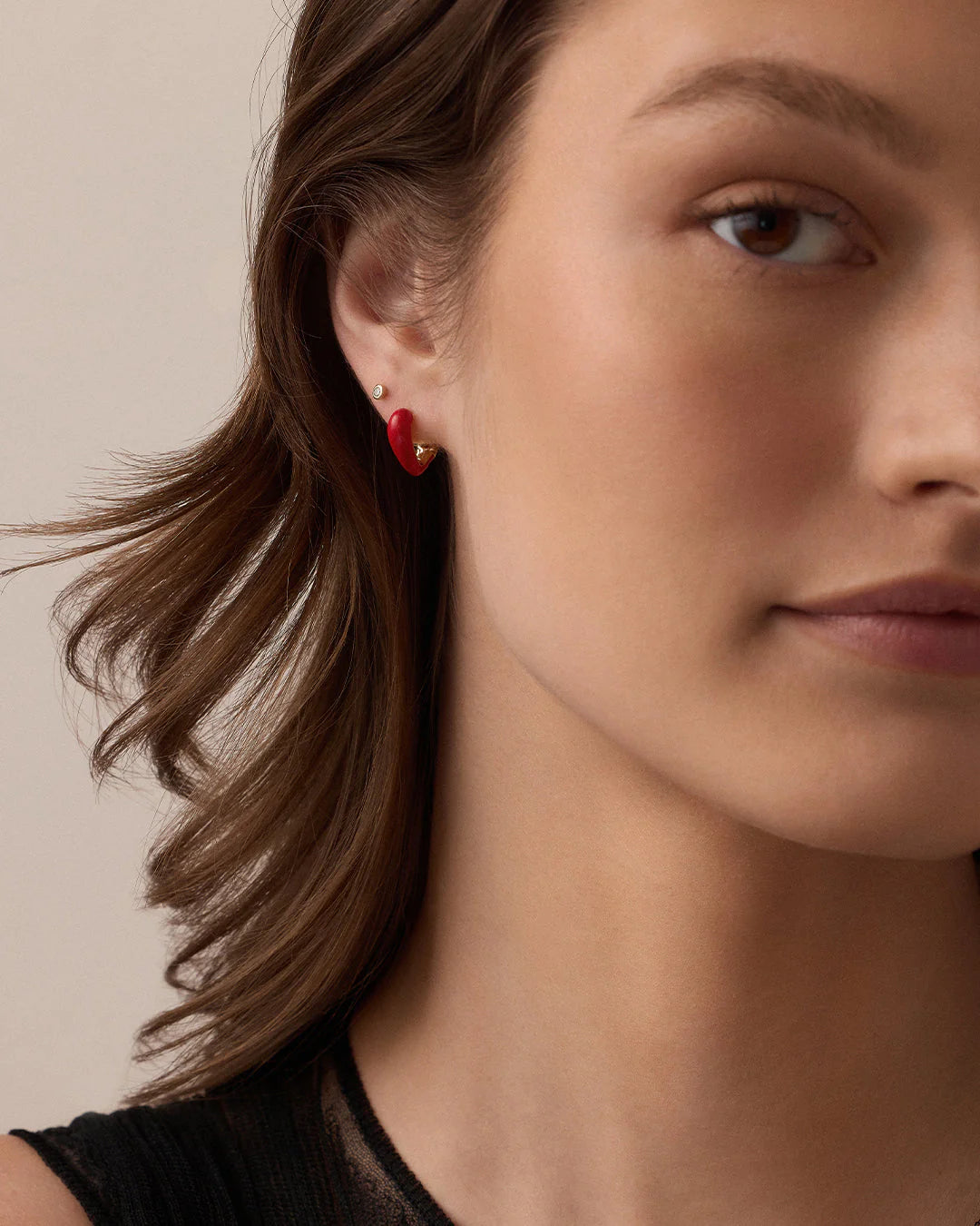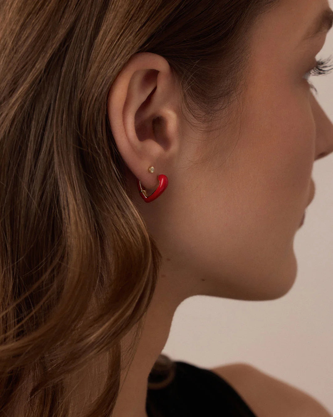 The perfect mix of edgy and sweet, these 18k gold plated huggie hoop earrings feature a heart design in a rich crimson. Their size and fit makes them ideal for first or second piercings, letting you stack them effortlessly alongside other hoops and studs to create a look that’s uniquely yours.