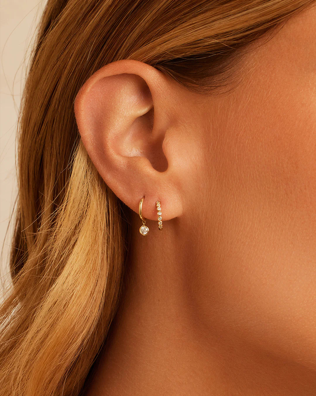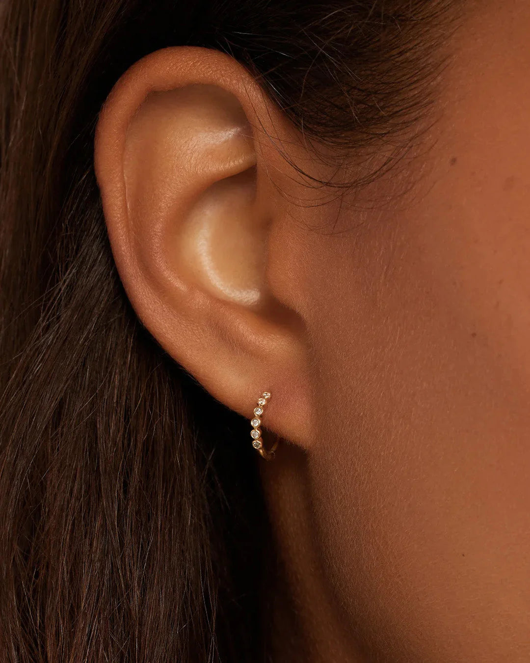 This diamond huggie earring is crafted from solid gold, making it a timeless and luxurious addition to any jewelry collection. Perfect for stacking or to wear alone, this diamond huggie provides long-lasting shine. Wear yours stacked with other diamond huggie hoop earrings and studs.