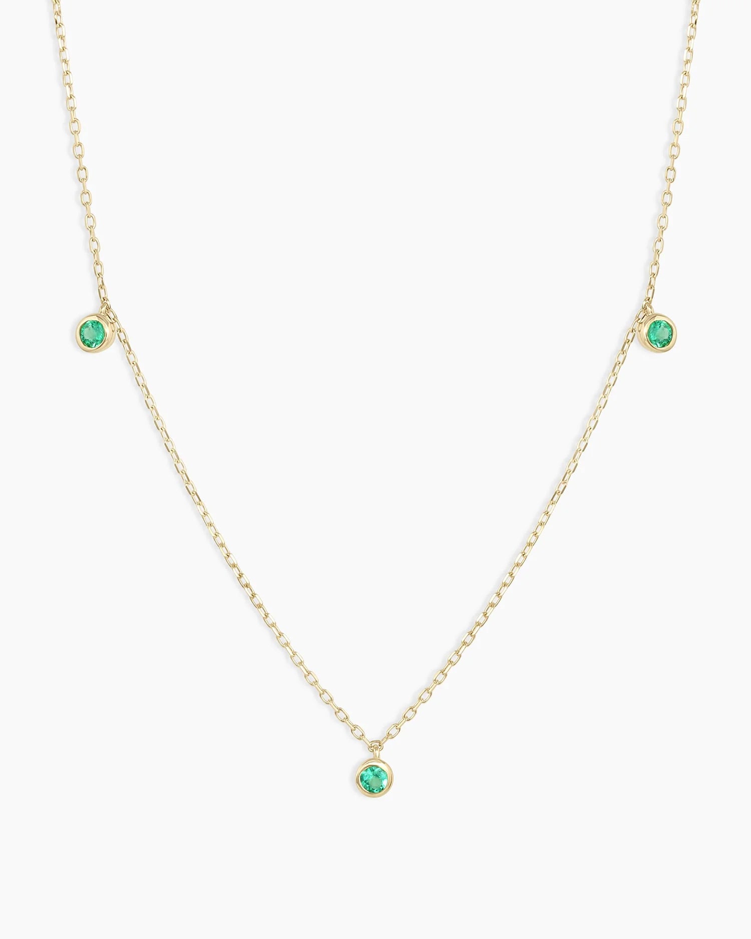 This adjustable, dainty gold chain necklace features three, brightly colored genuine emeralds. Into a matching moment? Pair your 14k solid gold emerald necklace with the emerald trio studs or emerald pavé 11 mm huggies.