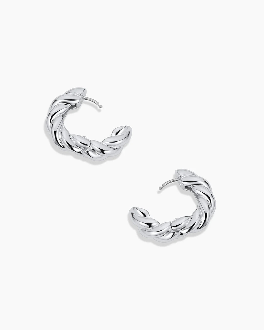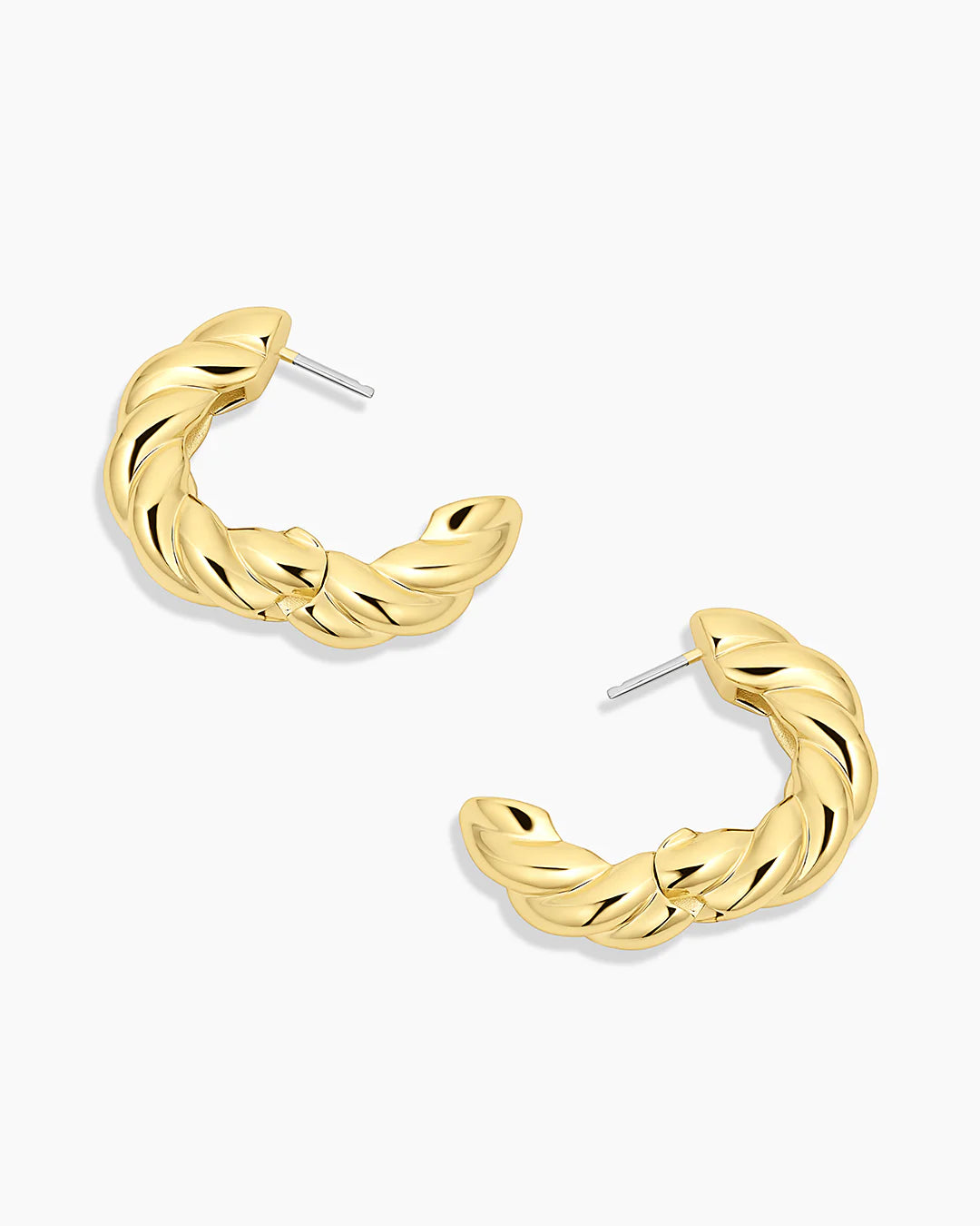 Elevate your style with the Crew Helium Hoops. Featuring a unique twist texture and helium design, these gold plated statement earrings transition seamlessly from day to night. We love wearing ours alongside gold and diamond studs.
