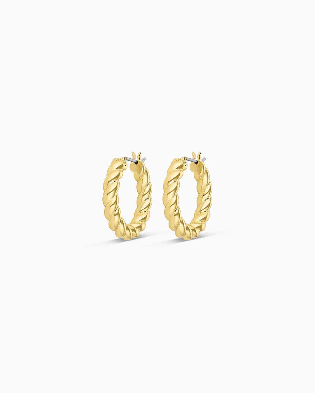Our exquisite Crew Hoops embody a timeless sophistication. Exquisitely crafted from gold plated material with an eye-catching twist design, these hoops add a touch of elegance to any look. Ideal for any special occasion, these earrings are the perfect choice for first piercings.