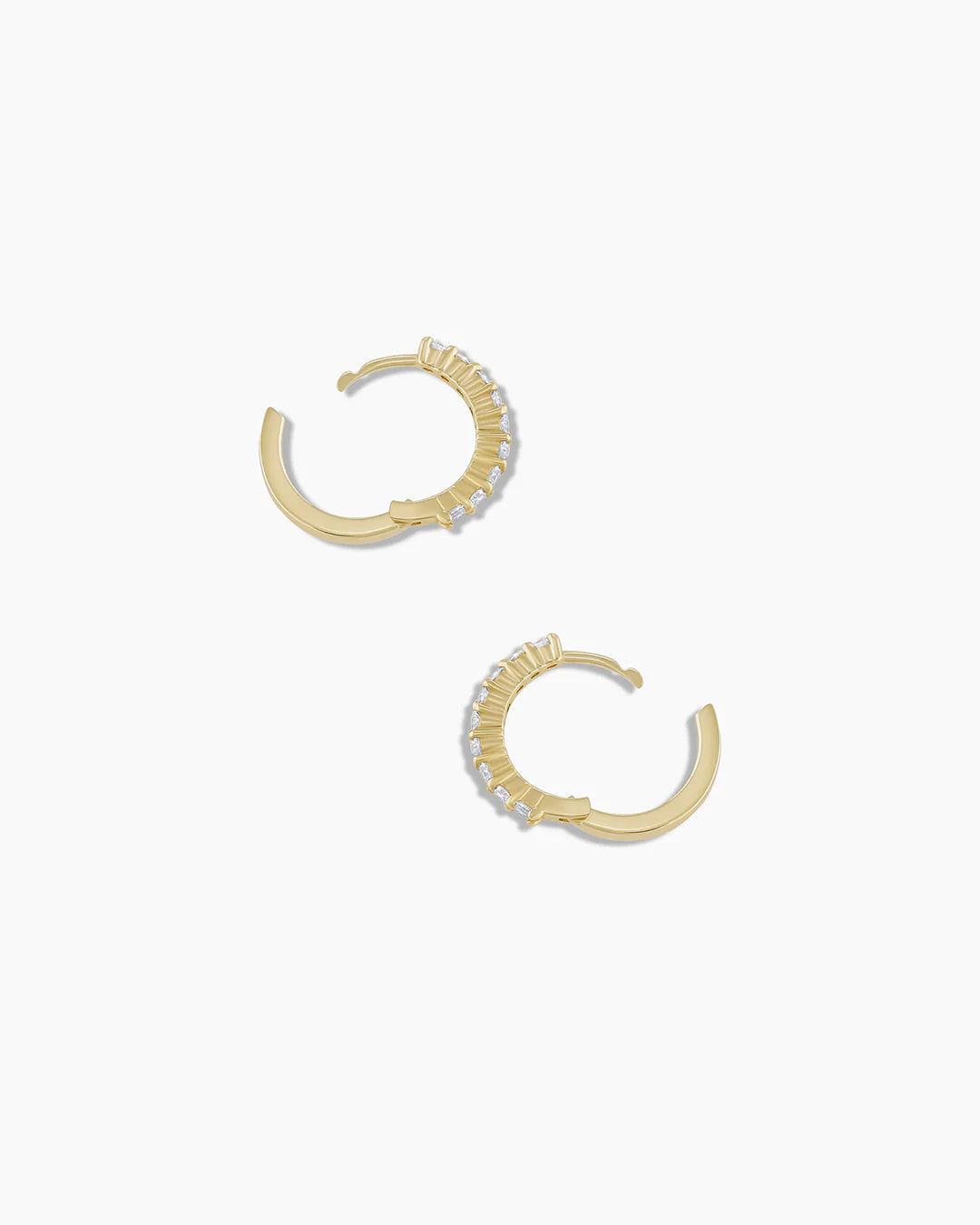 Crafted from 14k solid gold and eighteen dazzling diamonds, these diamond earrings will add an elegant touch to any look. Wear alone for a subtle statement, or stack with other huggies for maximum impact.