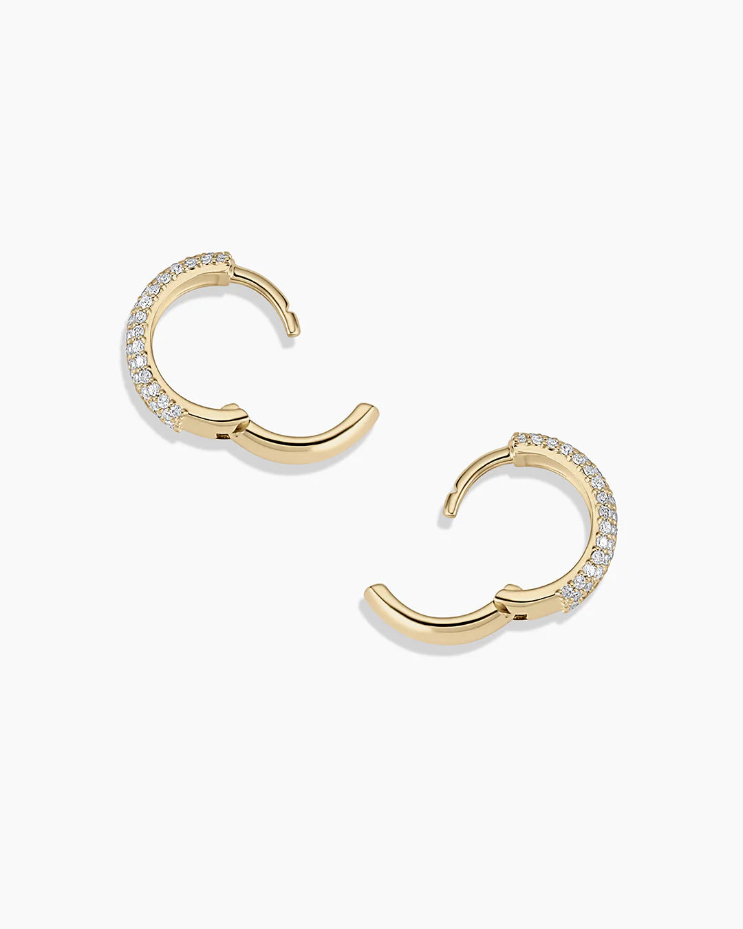 Set with even more brilliant diamonds, these 14k solid gold diamond huggie earrings bring insane shine to your everyday stack. Designed for stacking or styling alone, they're a forever-worthy addition to your ear stack.