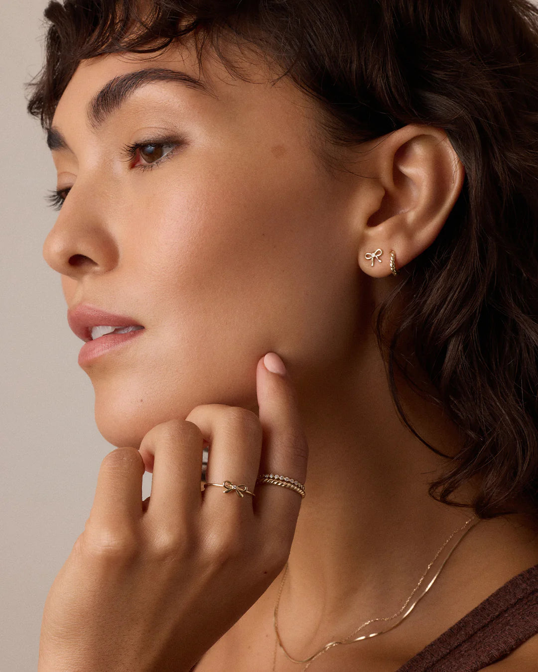 Crafted in 14k solid gold and tied up with a single sparkling diamond, this ring is timeless and feminine. Whether you’re the type who likes to keep it minimal or you prefer a major ring stack, this ring plays well with others (and looks equally good solo). Perfect for gifting or giving your own stack some girlish flair, this is one bow you’ll never want to untie.