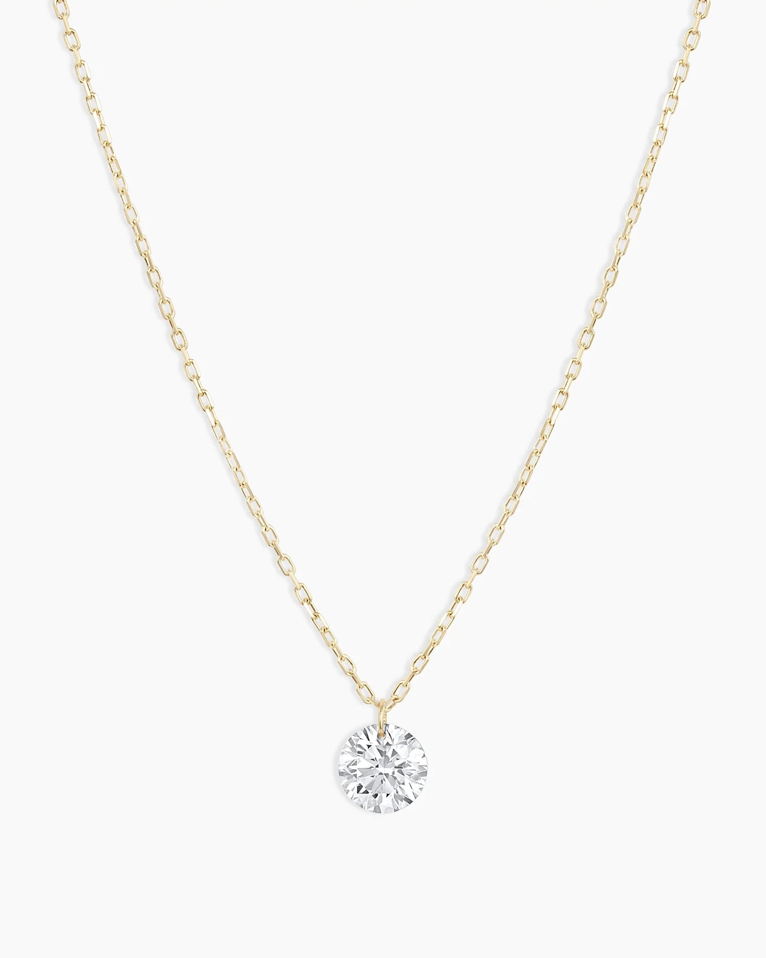 Free from any setting, this diamond appears to float on your skin and catch the light in the most beautiful way. This diamond necklace features an adjustable solid gold chain. Wear this floating diamond necklace alone as a solo statement or with a 14k gold Chain Necklace.