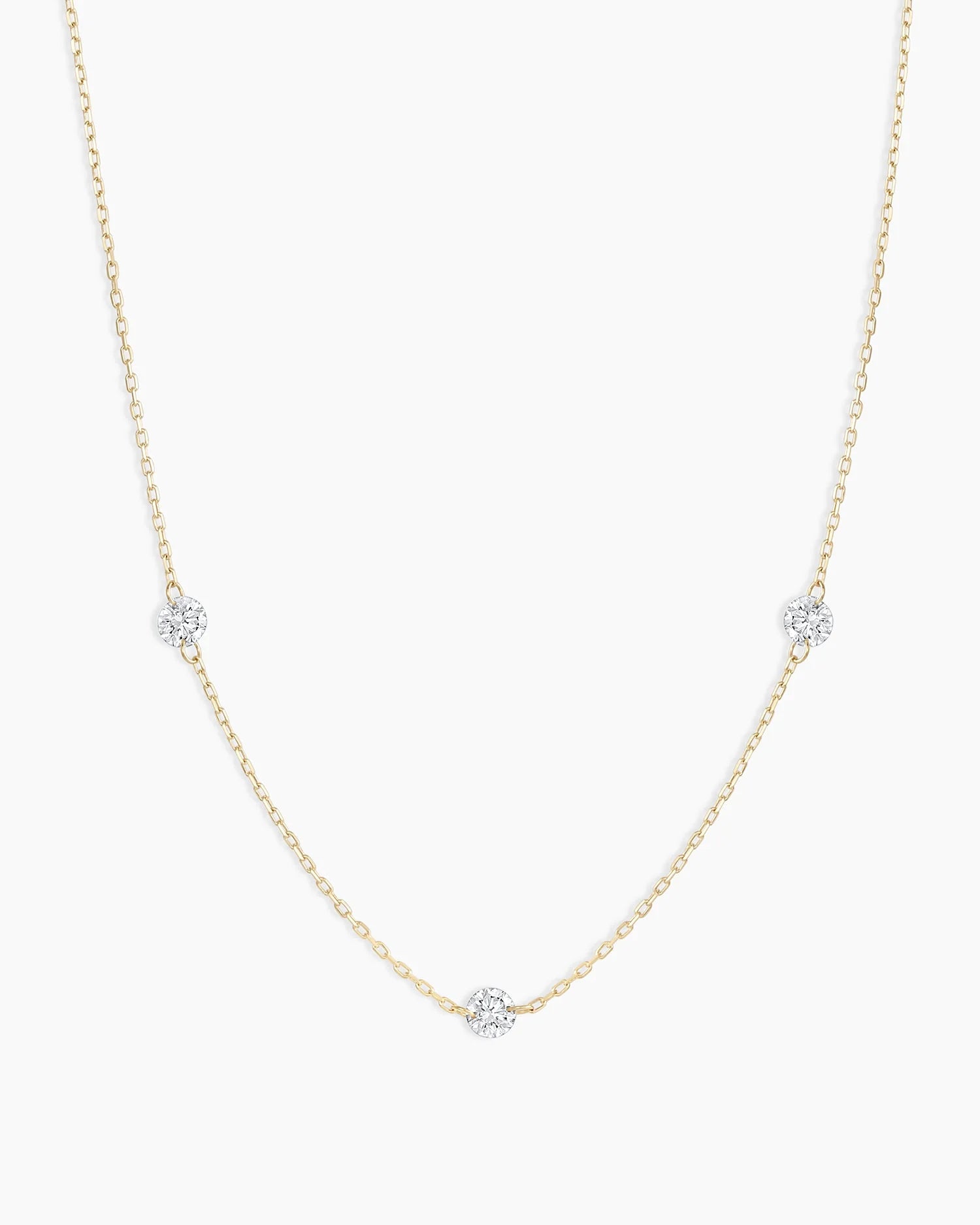 This solid gold Floating Diamond Stationary Trio Necklace features three diamond stones expertly embedded into a solid gold necklace. Dainty and adjustable, the necklace is perfect for adding a touch of sparkle to any outfit. Layer yours with longer solid gold or diamond necklaces.