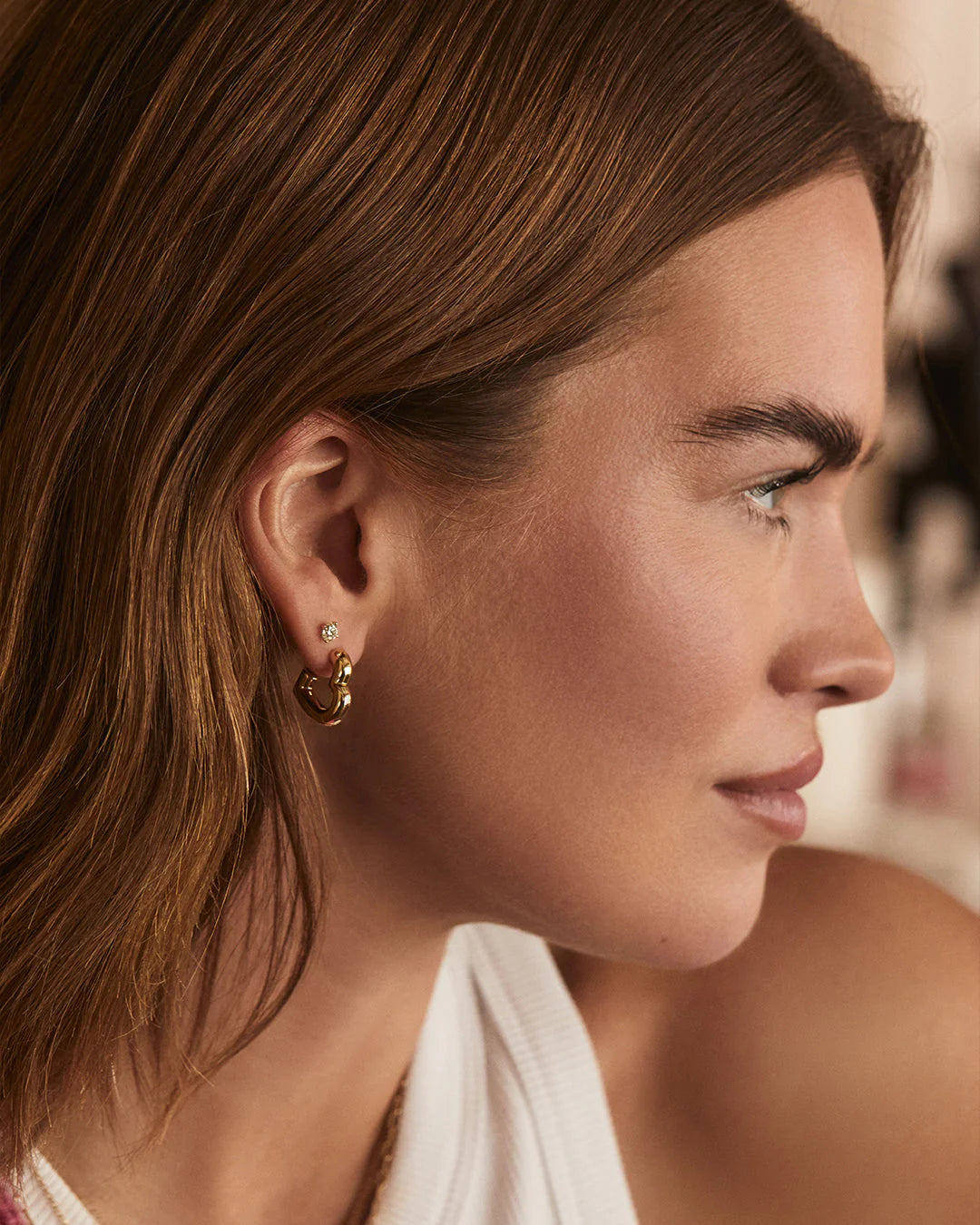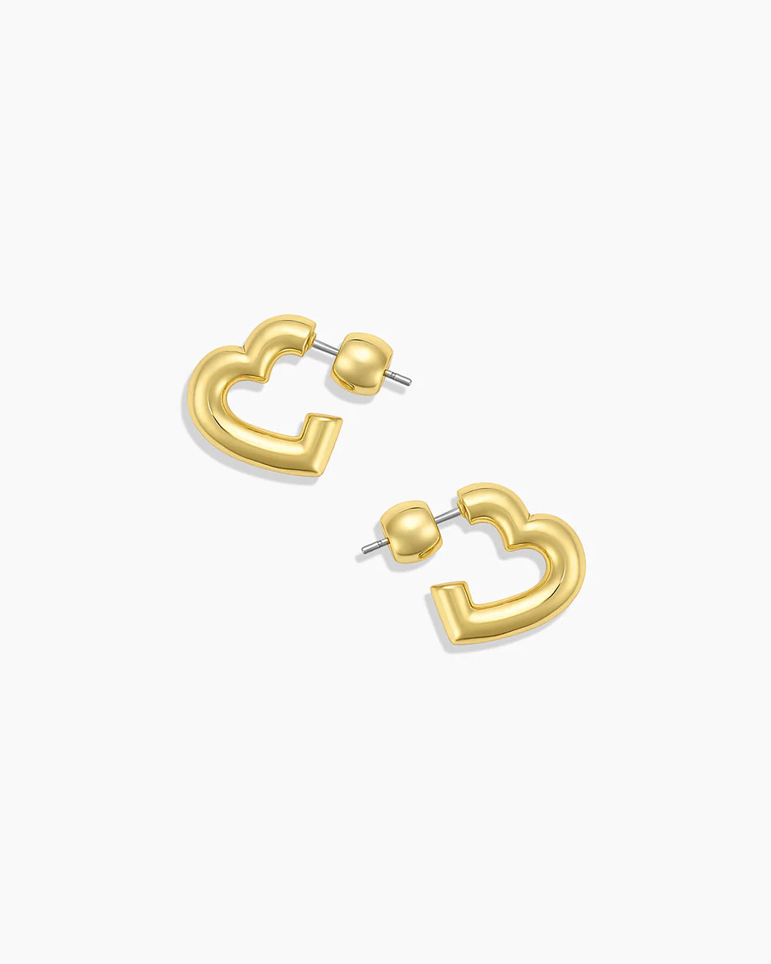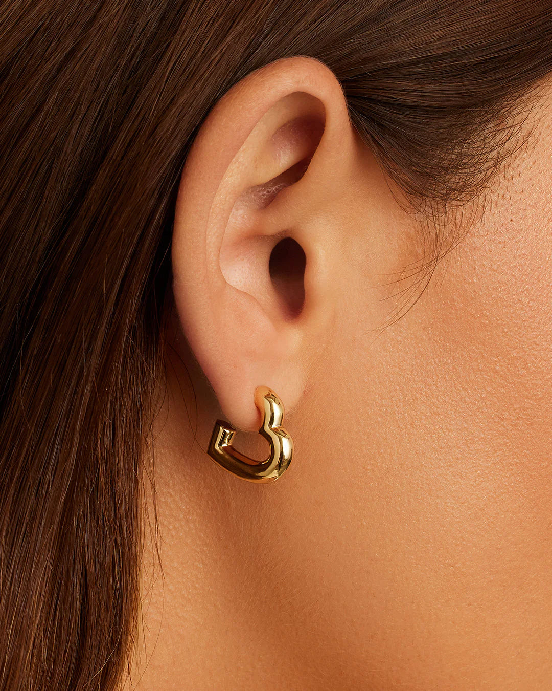 The Lou Statement Heart Huggies add a sweet statement to your everyday look. These lightweight gold heart huggie earrings are perfect in first piercings and effortlessly complement your favorite huggies and studs for a beautiful, fully stacked look.