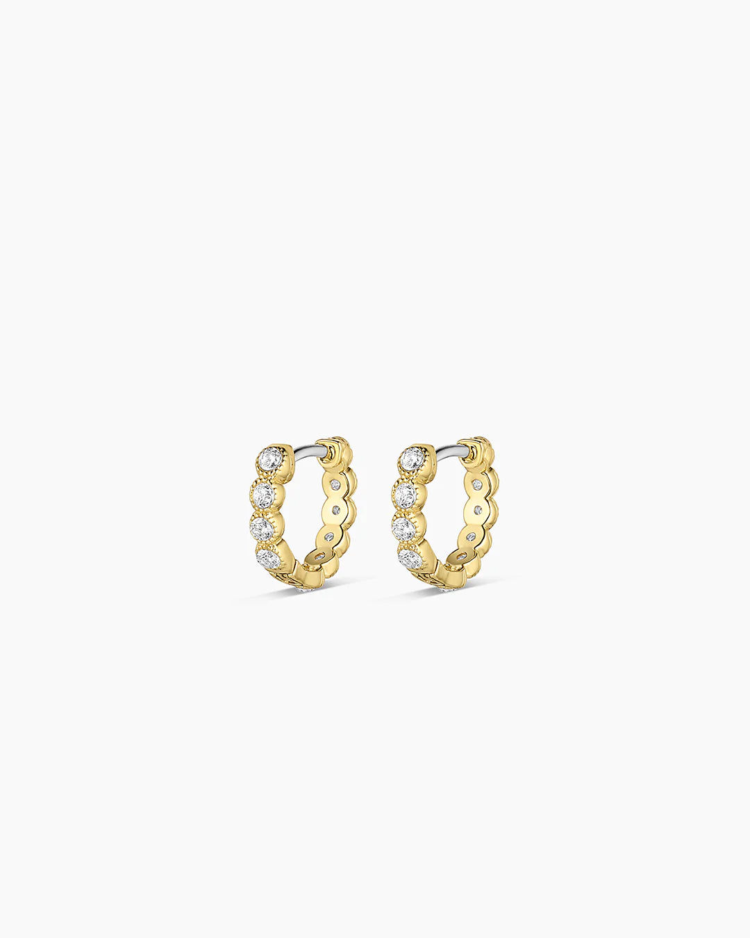 Elevate your everyday look with the Madison Shimmer Huggies. These gold plated huggie hoop earrings boast a timeless design and radiant cubic zirconia stones that subtly shine. Perfect for any occasion that calls for a chic and polished statement.