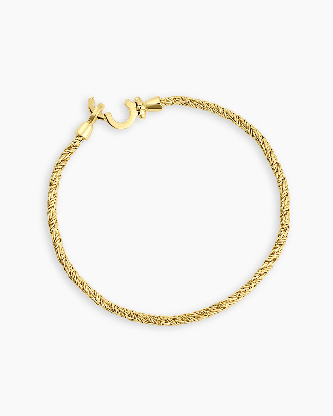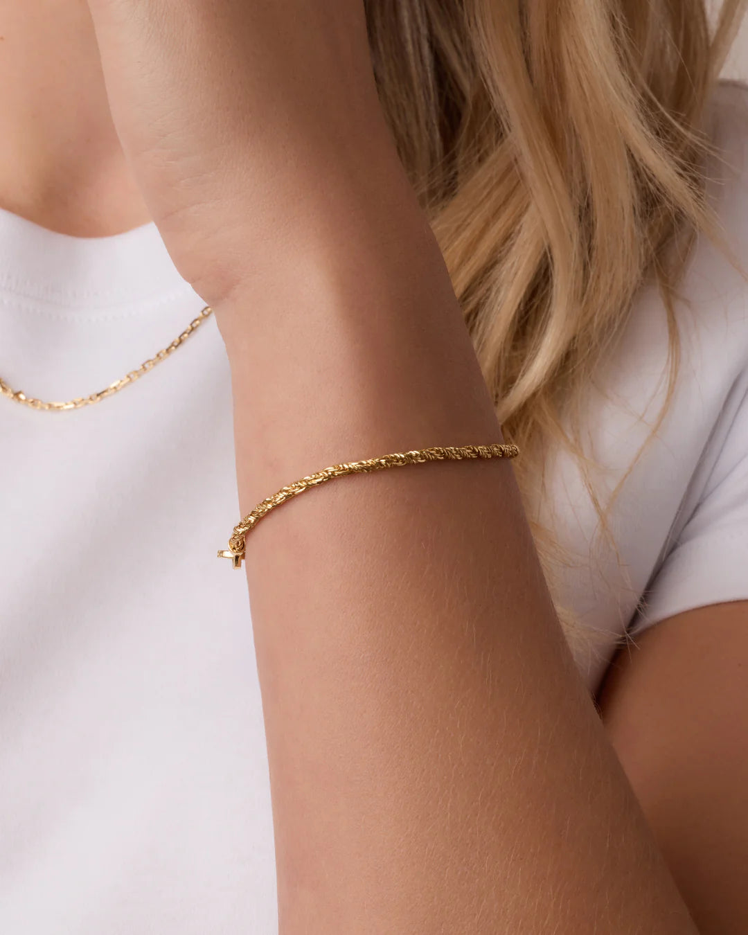 This beautiful bracelet is crafted from gold plated metal with a unique rope design. Its textured effect creates a stunning look that is perfect for any occasion. We love it paired with other gold plated chain bracelets for a fully stacked look.