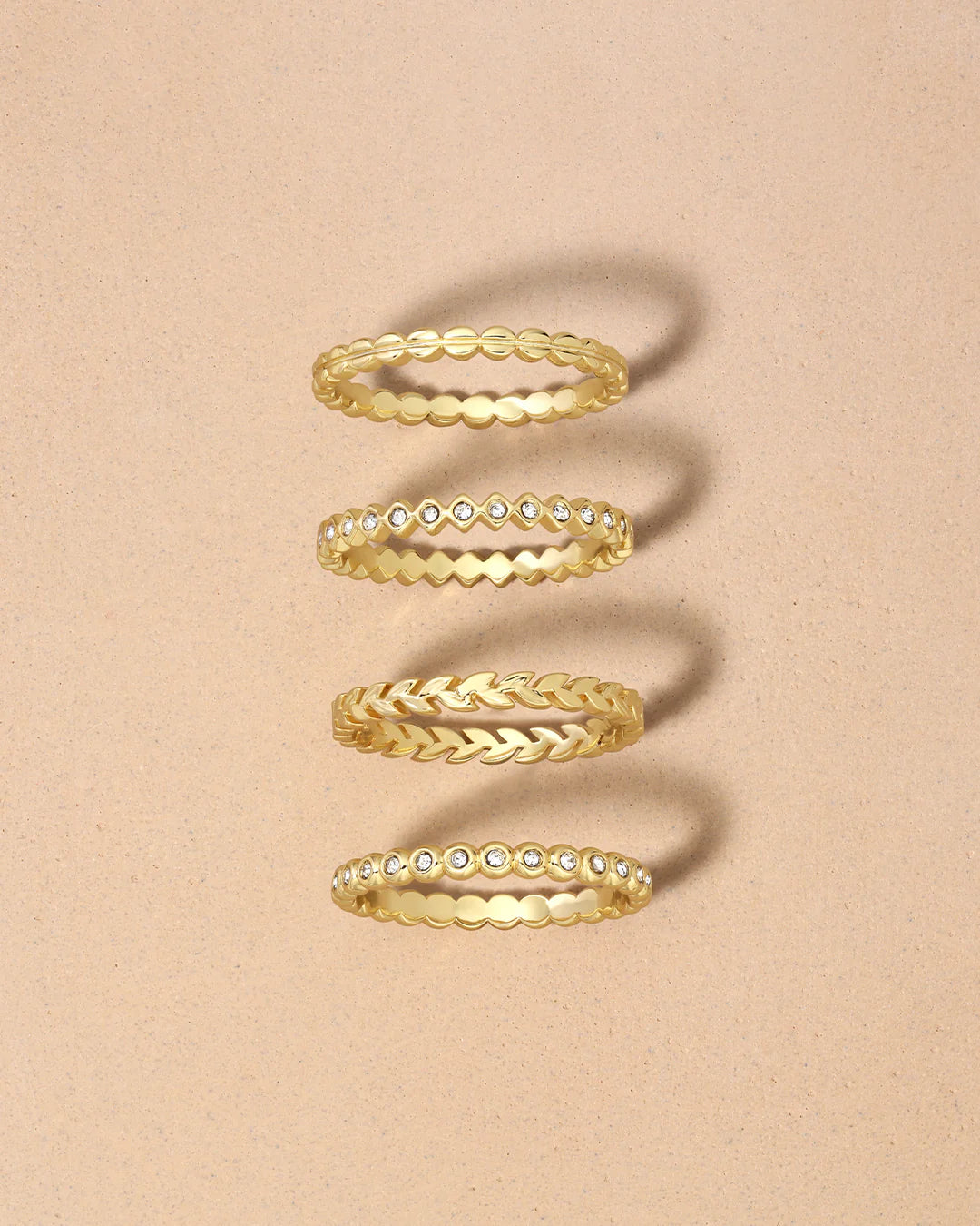 This beautiful, gold-plated Mini Stackable Ring Set features four rings embellished with cubic zirconia stones. This dainty ring set is perfect to mix and match with other rings for a unique ring stack.