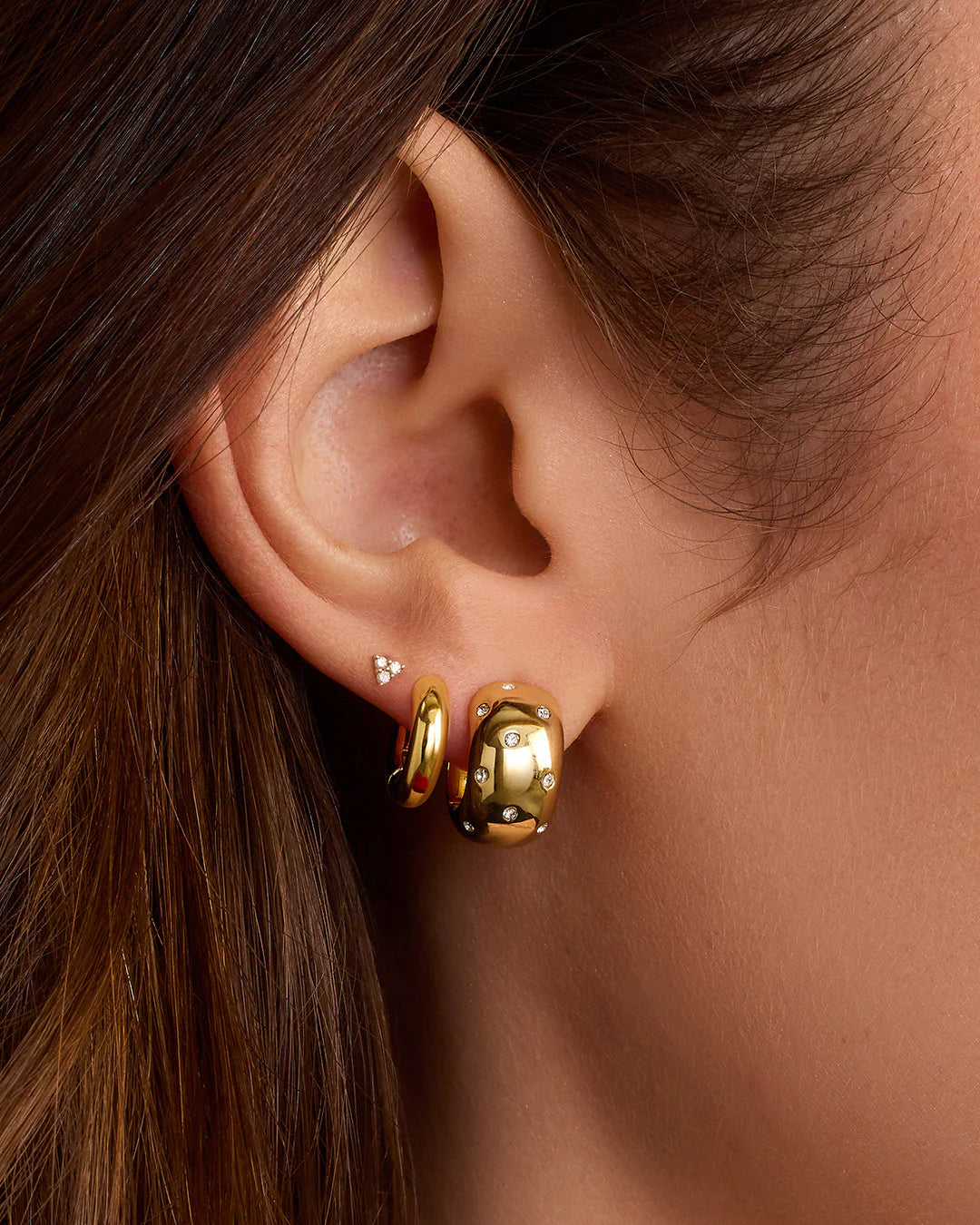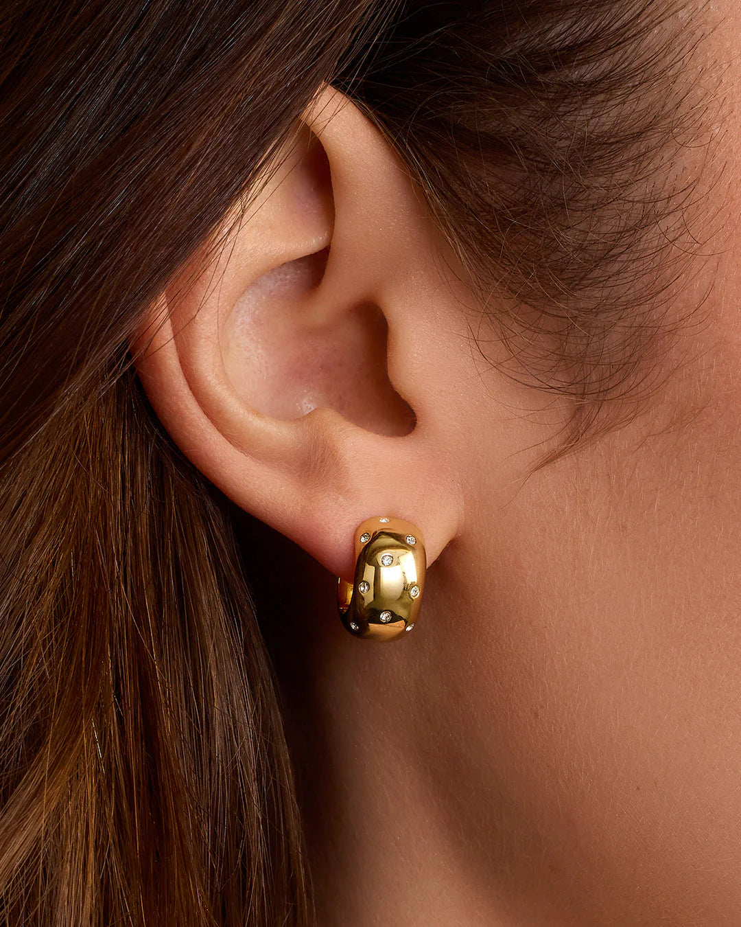 Wear these shining, statement huggie hoops alone for a subtle, chic statement or style them with your favorite earrings to add a playful, holiday party-ready twist to your ear stack.
