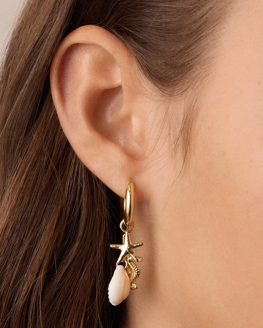 These memorabilia-inspired hoop earrings feature mini dangling charms that evoke nostalgia for a seaside escape—each one symbolizing sun-drenched days and the spirit of summer. These are the perfect keepsake (and style to wear) throughout the season.