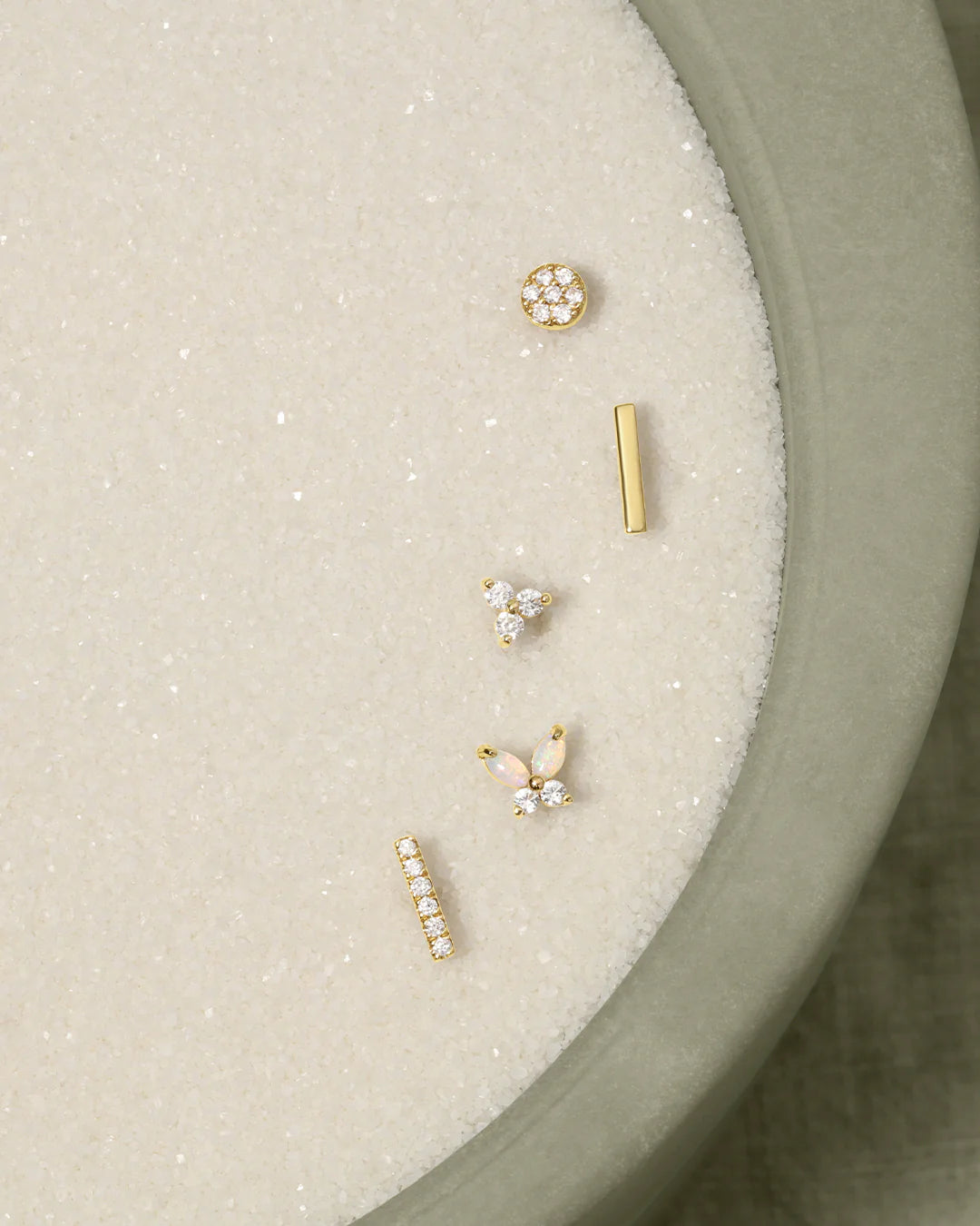 This opal butterfly stud earring is crafted from solid gold, making it a timeless and luxurious addition to any jewelry collection. Perfect for stacking or to wear alone, this butterfly stud provides long-lasting shine. Wear yours stacked with other diamond huggie hoop earrings and studs.