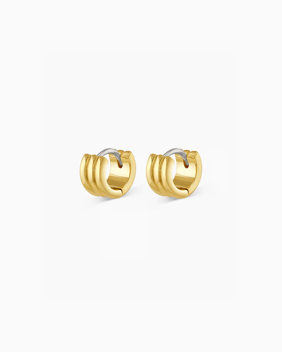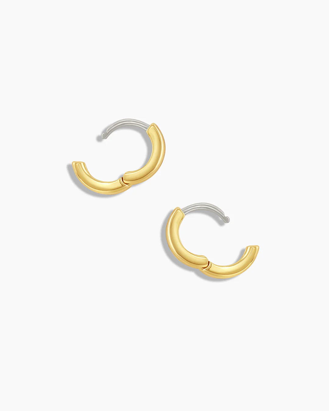 The Reed Huggies add instant style to any look with their modern-style design. Crafted with a gold plated finish, these classic hoop earrings are perfect worn solo or stacked in first piercings alongside your favorite stud earrings and huggie earrings.