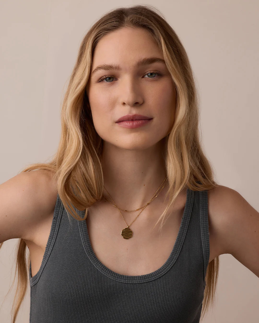 This beautiful, gold plated Sunset Coin Necklace is inspired by the beautiful Pacific Coast and features a rippling texture reminiscent of a sunset reflecting off the ocean. It's the perfect longer chain to complete your layered look.